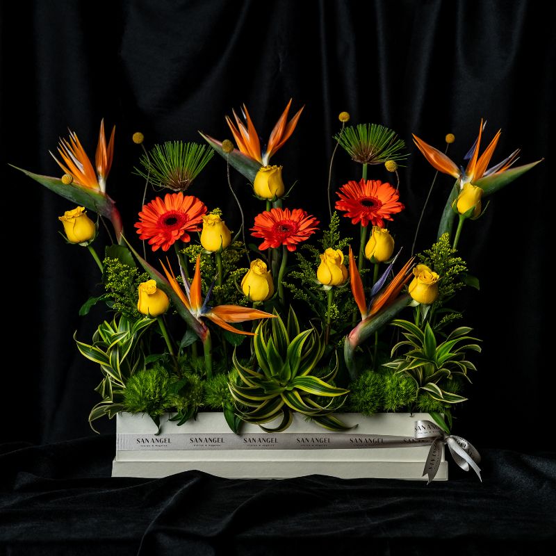 Arreglo floral en caja rectangular decorativa, rosas, gerberas, aves del paraíso, canción de la india, craspedias y solidago. Incluye tarjeta. Envío Grais.