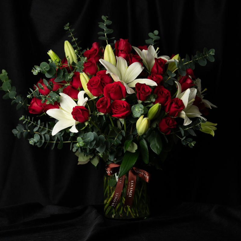 Hermoso arreglo floral con 50 rosas y lirios en florero de vidrio. Envío Gratis. Incluye Tarjeta.