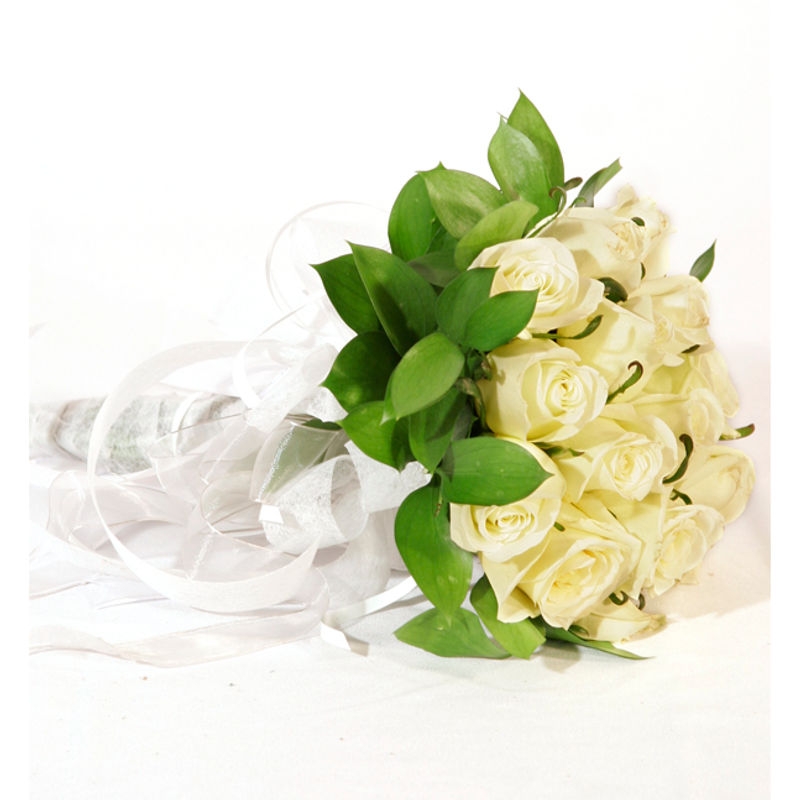 HERMOSO YUGO DE NOVIA CON 24 ROSAS BLANCAS, RODEADAS DE RUSCO,LIRIOPE Y BELLAMENTE COMPLEMENTADO CON CINTAS DE DIFERENTES TEXTURAS.